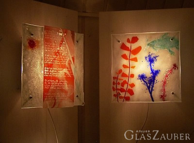 Gartenobjekte Kronleuchter Windlichter Anhänger Schmuck Mosaike Lampen Schalen Knöpfe Regale Bilder Vasen Teller Blüten Spiegel Winker Chapeux Windspiele Pâte de Verre Schichtbilder Bilderrahmen Perkussionsobjekte